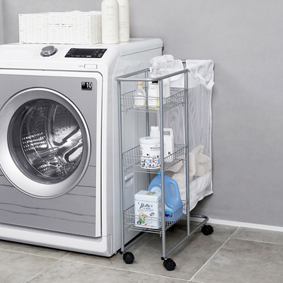 슬림해서 좁은 곳에도 쏙 들어가고, 바퀴 굴러가는 느낌도 엄청 부드럽습니다. 혼자 해도 충분할 정도로 조립도 쉬운 편이구요. 수납 바구니가 3칸이라 수납이 넉넉한 것도 맘에 듭니다. 사진 속에 맨 윗칸에 올려둔 세제통만 해도 3~4kg 정도는 될텐데, 끄떡 없는 걸 보니 생각보다 튼튼한 것 같아요.