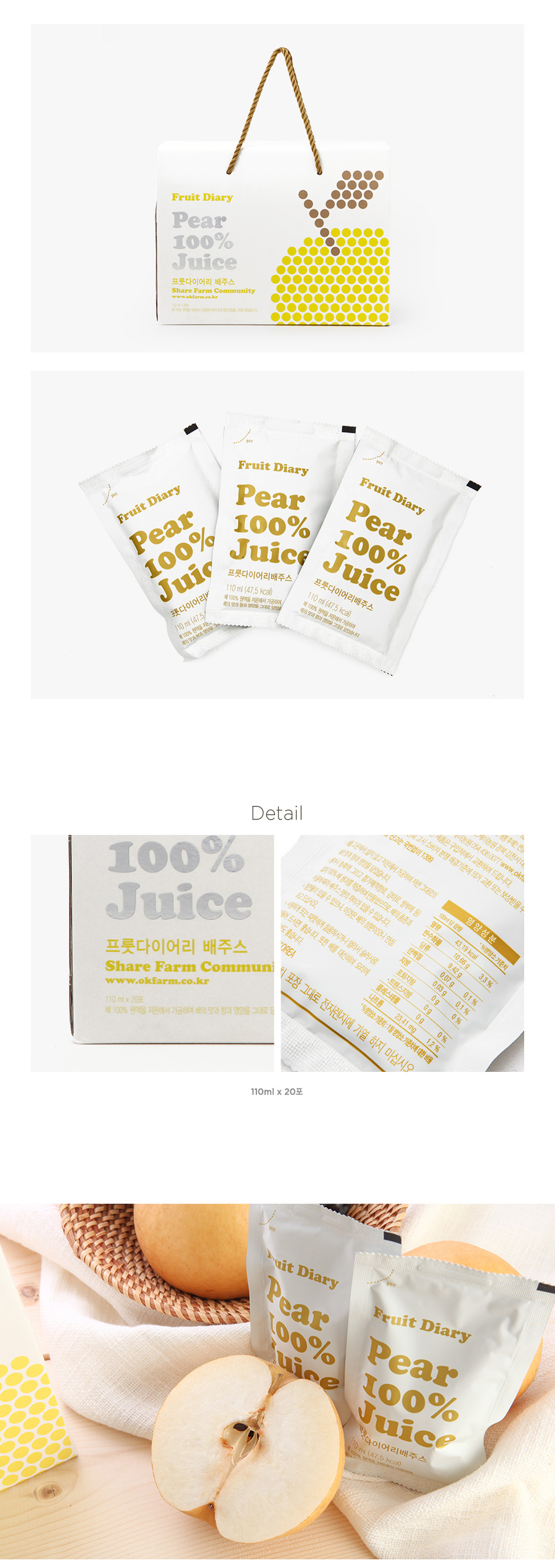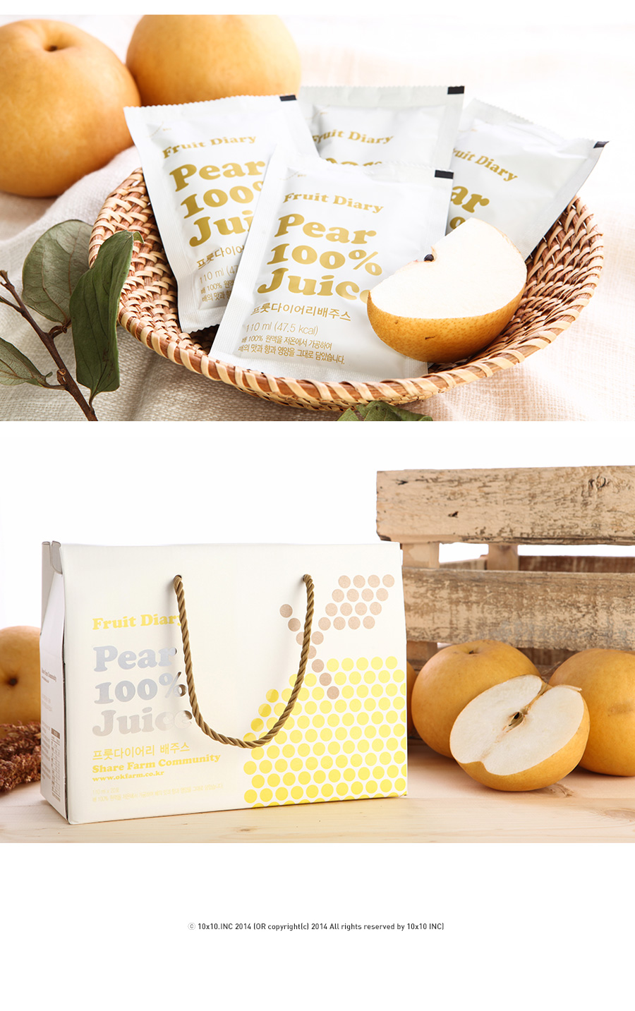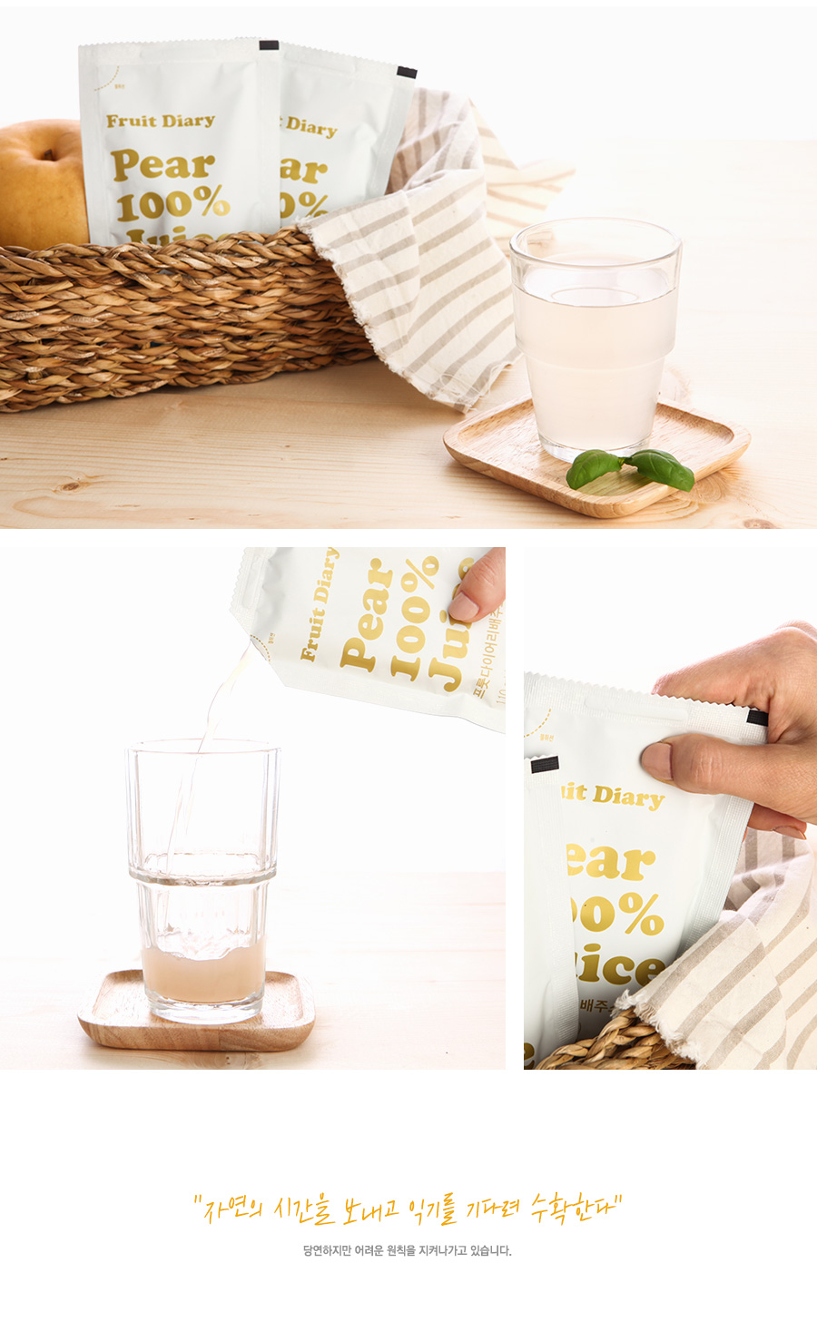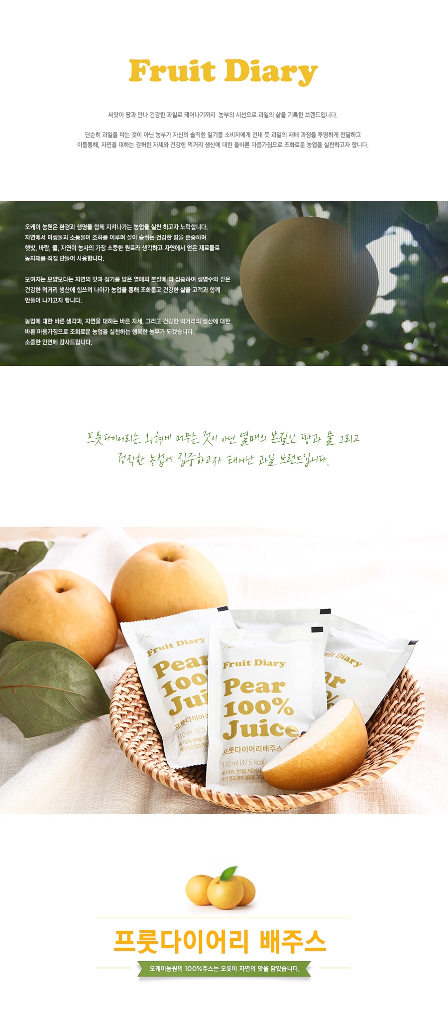 | Pear 100% Juice 프룻다이어리 배주스는 농원에서 생산한 배 본연의 맛을 잘 전달하기 위해 건강한 과일과 농부의 자부심을 담은 주스입니다. 프룻다이어리 배주스 특징 좋은 가공품의 첫째 조건은 좋은 원재료에 있습니다. ->농원에서 생산한 친환경 배로 가공합니다. 신선하고 건강한 열매로 농원의 가공시설에서 직접 생산합니다. 저온가공은 품종과 품질이 맛을 좌우합니다. ->맛을 결정짓는 원재료 배가 맛과 향이 좋은 품종입니다. 저온가공방식에 적합한 신품종 배로 맛과 향이 좋은 배주스를 만듭니다. NFC 주스 최적의 가공법으로 저온에서 원재료의 맛과 영양을 살리는 기술 -> 착즙된 배 100% 과즙은 최적의 온도와 시간을 통해 배주스로 재탄생되어 일년내내 간편하게 먹을 수 있습니다. 소량한정생산 ->농원에서 생산한 배로만 한정생산하며 품질을 유지하고 있습니다. |