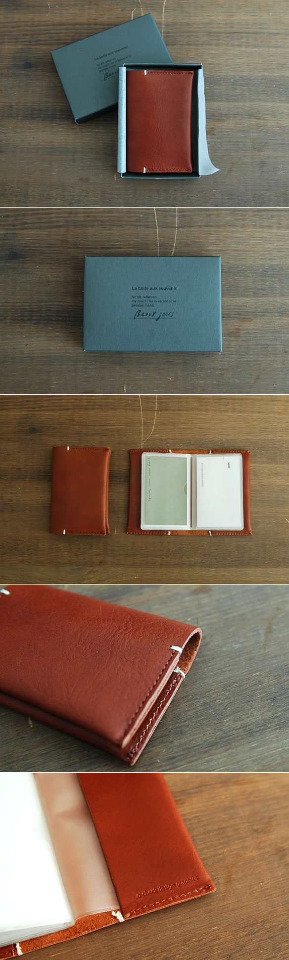 | leather card case_brown 공책의 leather case 제품들이 더 고급스러운 가죽과 색감으로 다시 제작되었습니다. 브라운색상의 가죽은 붉은 빛깔이 살짝 감도며 자연스럽고 내츄럴한 가죽의 느낌을 최대한 살리기 위하여 가공한 제품입니다. 가죽 위 흰색스티치'가 포인트가 되어 가방속 멋진 소지품이 되어 줄 것입니다. 손에 닿으면 닿을 수록 익숙해진 가죽은 오래도록 멋진 모습으로 함께 할 거예요. *10매로 구성된 비닐속지는 교통카드와 함께 각종 카드를 편리하게 넣고 다닐 수 있어요. material_ leather (비닐속지 포함) size_ 7.5cm x 11cm |