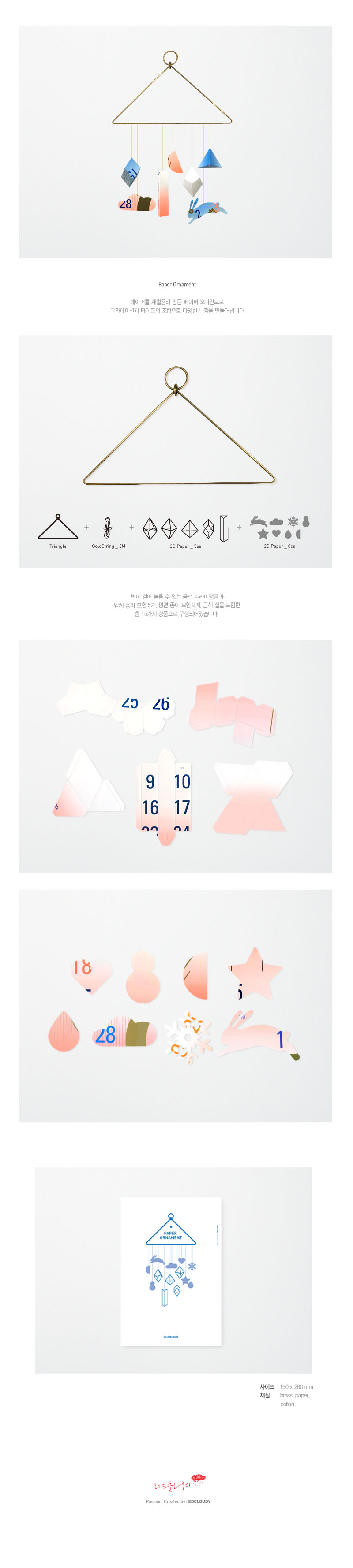 캘린더를 재활용해 만든 페이퍼 오너먼트로 벽에 걸어놓을 수 있는 트라이앵글과 입체 종이모형 5개, 평면 종이모형 8개, 금색 실이 들어있습니다.