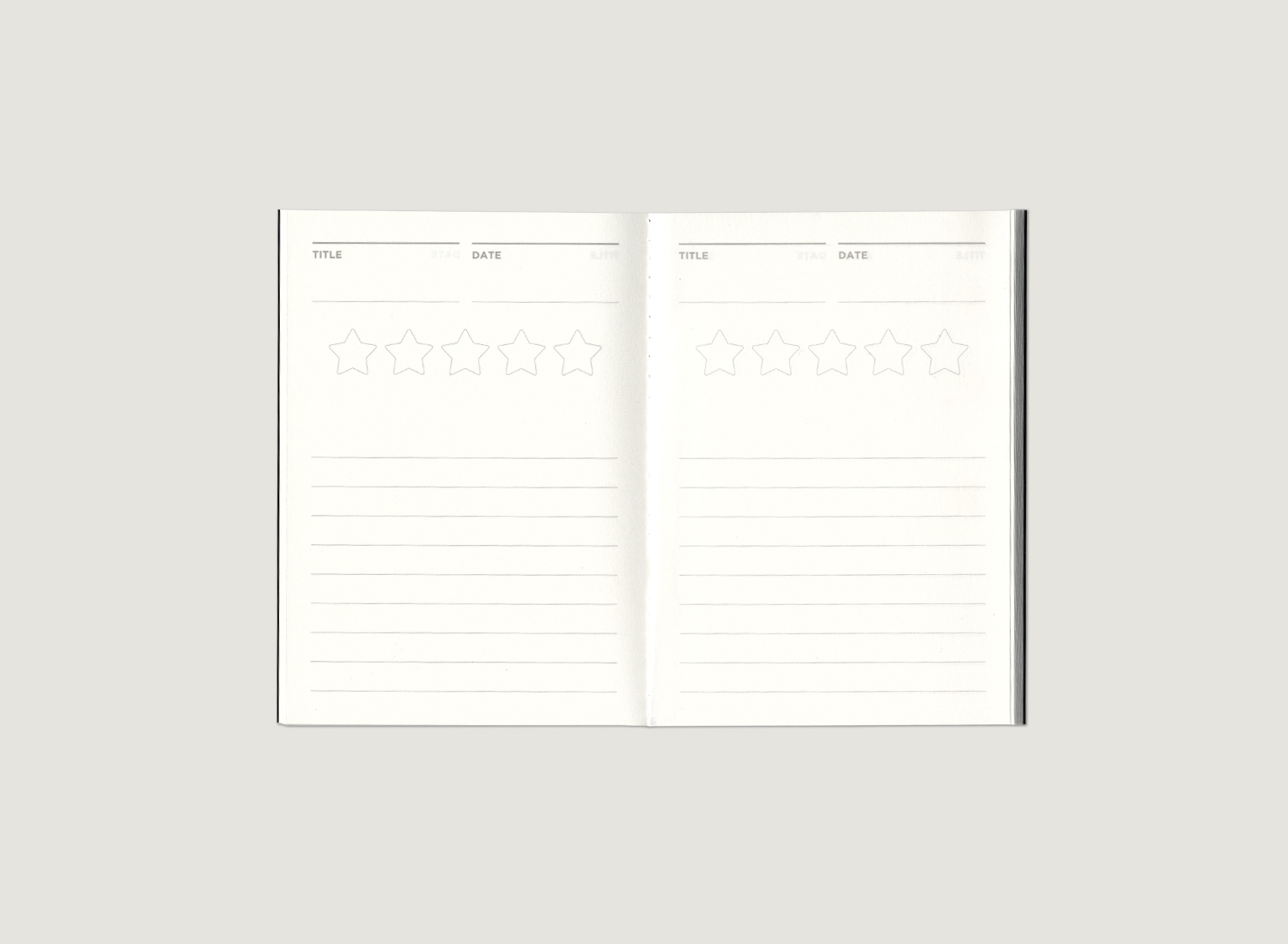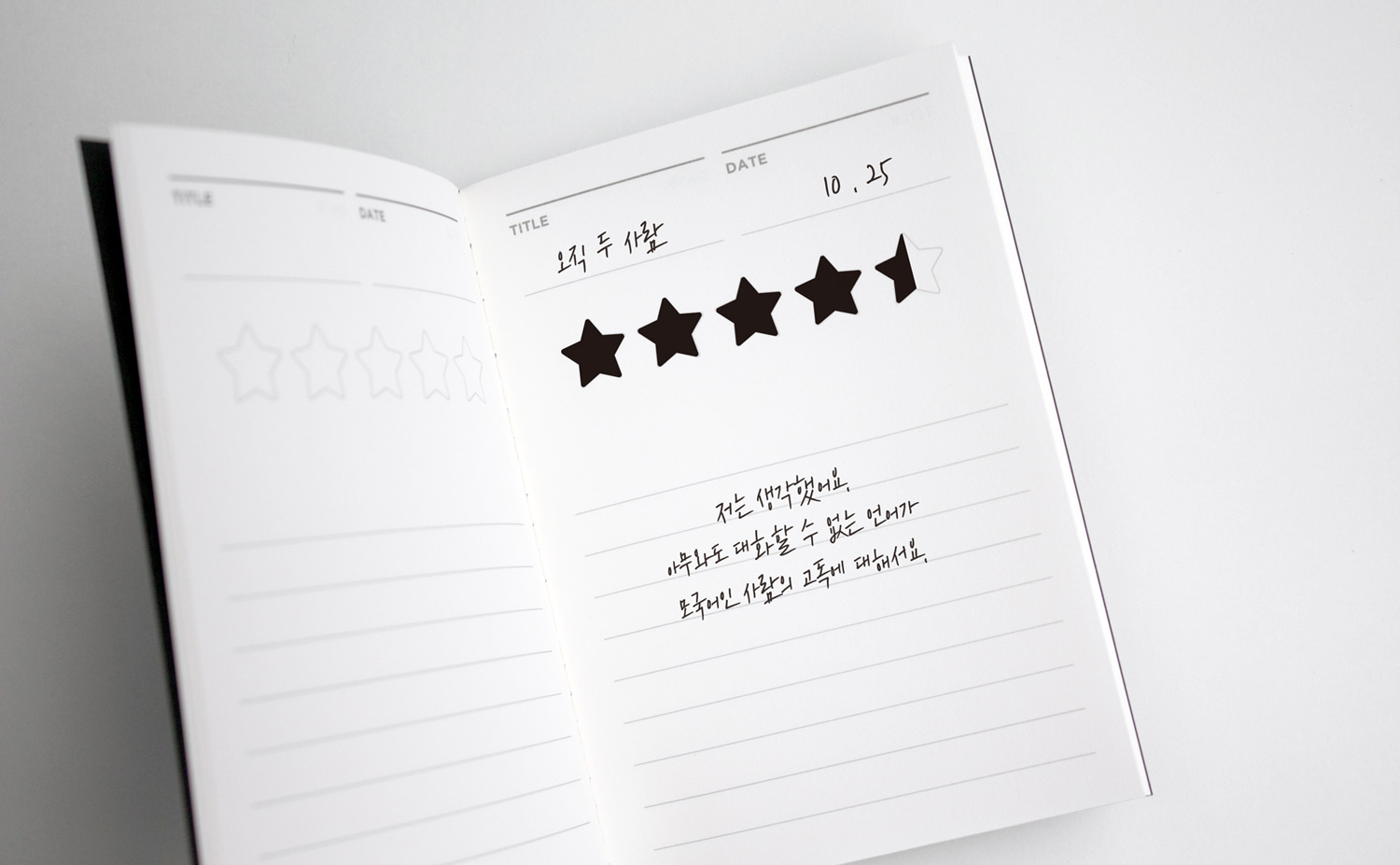 REVIEW BOOK lite 리뷰북 라이트를 소개합니다. 여권사이즈로 작고 가벼워 휴대성이 좋은 리뷰북 입니다. 자신만의 리뷰를 남기고 함께 들어있는 별 스티커를 이용해 별점을 매겨보세요. 총 48 page 중 제목(title page) - 1page (첫장은 제목을 적을 수 있습니다.) 리뷰 - 44page / 44편 리뷰 가능 인덱스 - 1page 내지의 마지막 페이지는 기록의 시작과 끝을 표기할 수 있도록 구성되어있습니다. (날짜, 장소) 사양 *표지 - FSC 산림 인증 종이입니다. - 무염소 표백 펄프를 사용한 종이 입니다. - 보존성이 우수한 중성지 / Acid free : PH neutral - 벌목과 조림이 잘 관리되는 지속 가능한 산림으로부터의 펄프만을 사용합니다. |