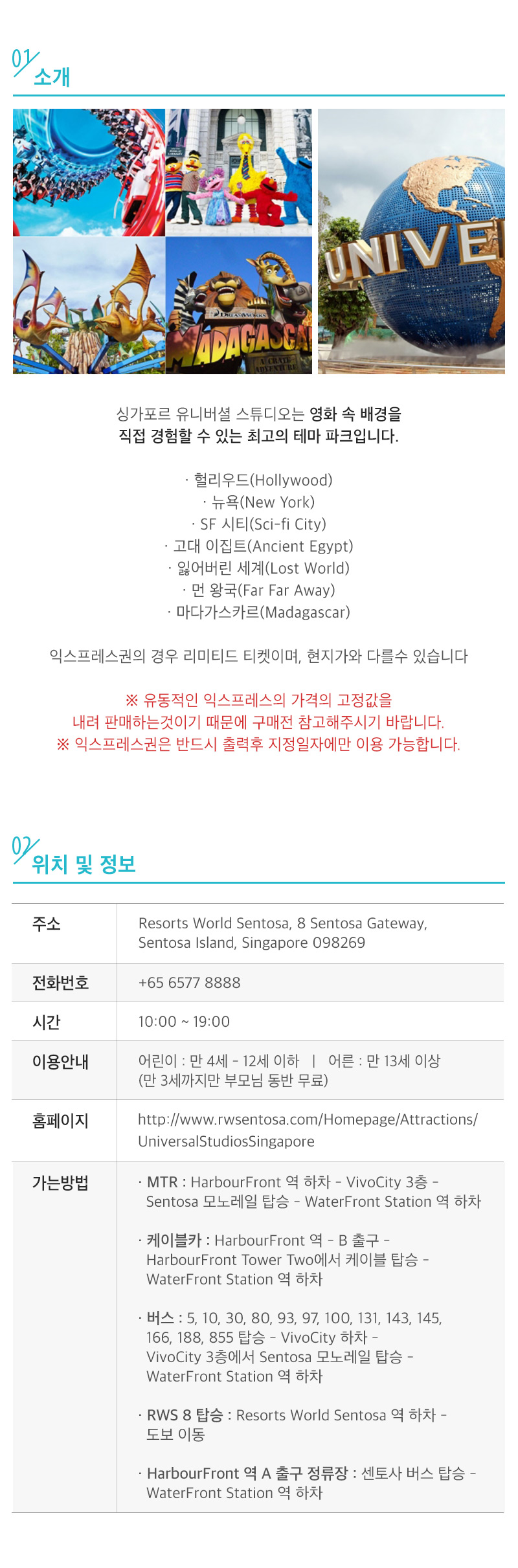 | 싱가포르 유니버셜 스튜디오는 영화 속 배경을 직접 경함할 수 있는 최고의 테마 파크입니다. · 헐리우드(Hollywood) · 뉴욕(New York) · SF 시티(Sci-fi City) · 고대 이집트(Ancient Egypt) · 잃어버린 세계(Lost World) · 먼 왕국(Far Far Away) · 마다가스카르(Madagascar) 익스프레스권은 반드시 출력후 지정일자에만 이용가능합니다 익스프레스권의 경우 리미티드 티켓입니다. 리미티드 티켓은 아래 어트랙션을 각각 1회씩만 사용 가능합니다. ▸ Pantages Hollywood Theater ▸ Lights, Camera, Action!™ Hosted by Steven Spielberg ▸ Sesame Street Spaghetti Space Chase ▸ TRANSFORMERS The Ride: The Ultimate 3D Battle ▸ Battlestar Galactica: CYLON® ▸ Battlestar Galactica: HUMAN® ▸ Accelerator™ ▸ Revenge of the Mummy™ ▸ Treasure Hunters™ ▸ Jurassic Park Rapids Adventure™ ▸ Canopy Flyer™ ▸ Dino-Soarin'™ ▸ WaterWorld™ ▸ Puss In Boots' Giant Journey ▸ Shrek 4-D Adventure ▸ Donkey LIVE ▸ Enchanted Airways ▸ Madagascar: A Crate Adventure ▸ King Julien's Beach Party-Go-Round 익스프레스권은 현지가와 다를수 있습니다 * 유동적인 익스프레스의 가격을 고정값을 내려 판매하는것이기 때문에 구매전 참고해주시기 바랍니다. 주소: Resorts World Sentosa, 8 Sentosa Gateway, Sentosa Island, Singapore 098269 전화번호: +65 6577 8888 시간: 10:00~19:00 어린이 : 만 4세 - 12세 이하|어른 : 만 13세 이상|※ 만 3세까지만 부모님 동반 무료 홈페이지: https://www.rwsentosa.com/Homepage/Attractions/UniversalStudiosSingapore 가는 방법 · MTR : HarbourFront 역 하차 - VivoCity 3층 -Sentosa 모노레일 탑승 - WaterFront Station 역 하차 · 케이블카 : HarbourFront 역 - B 출구 - HarbourFront Tower Two에서 케이블 탑승 - WaterFront Station 역 하차 · 버스 : 5, 10, 30, 80, 93, 97, 100, 131, 143, 145, 166, 188, 855 탑승 - VivoCity 하차 · VivoCity 3층에서 Sentosa 모노레일 탑승 - WaterFront Station 역 하차 · RWS 8 탑승 - Resorts World Sentosa 역 하차 - 도보 이동 · HarbourFront 역 A 출구 정류장 - 센토사 버스 탑승 - WaterFront Station 역 하차 티켓 사용 방법 · 인쇄된 바우처를 현지 입구에서 바코드 인식 후에 입장 가능합니다. · 익스프레스권은 반드시 출력하셔야 합니다. ※익스프레스 세트권은 이메일 발송까지 3~4일정도 소요되시기 때문에 반드시 출발일 4일전에 주문 넣어주세요. (주말,공휴일 발권이 안되시기때문에, 해당일 제외 4일 적용해주세요.) |