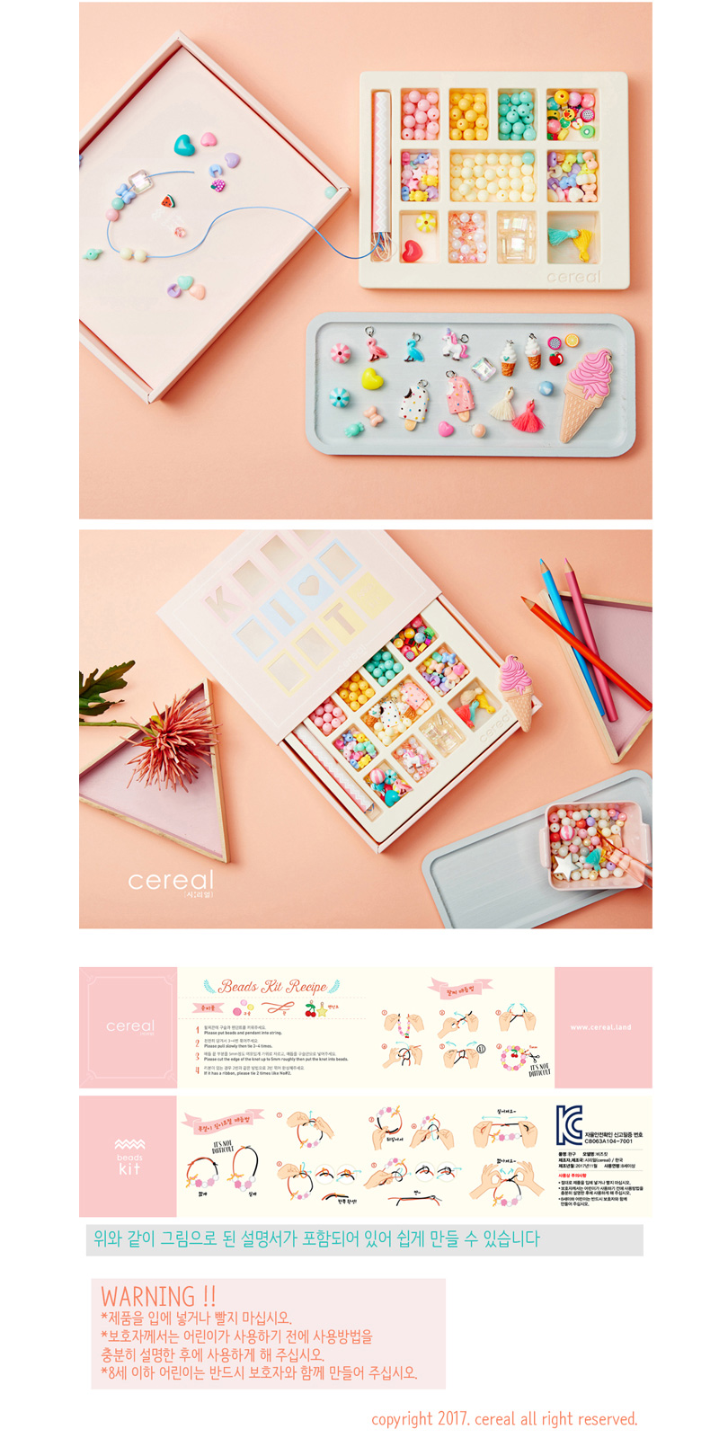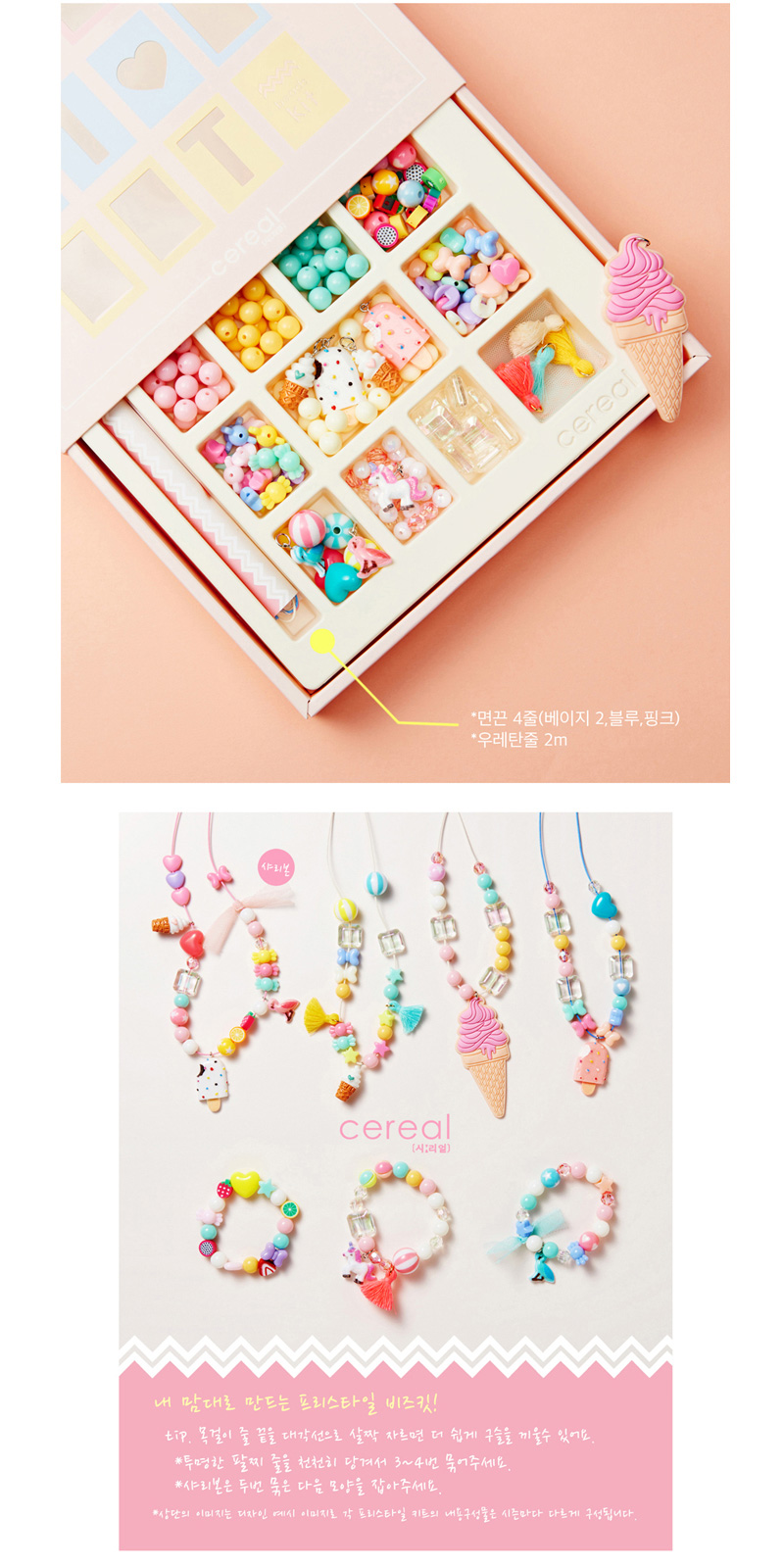 목걸이 4개, 팔찌 4개 이상의 제품을 만들수 있는 양의 구슬과 펜턴트등 다양한 구성품이 들어가 있습니다.