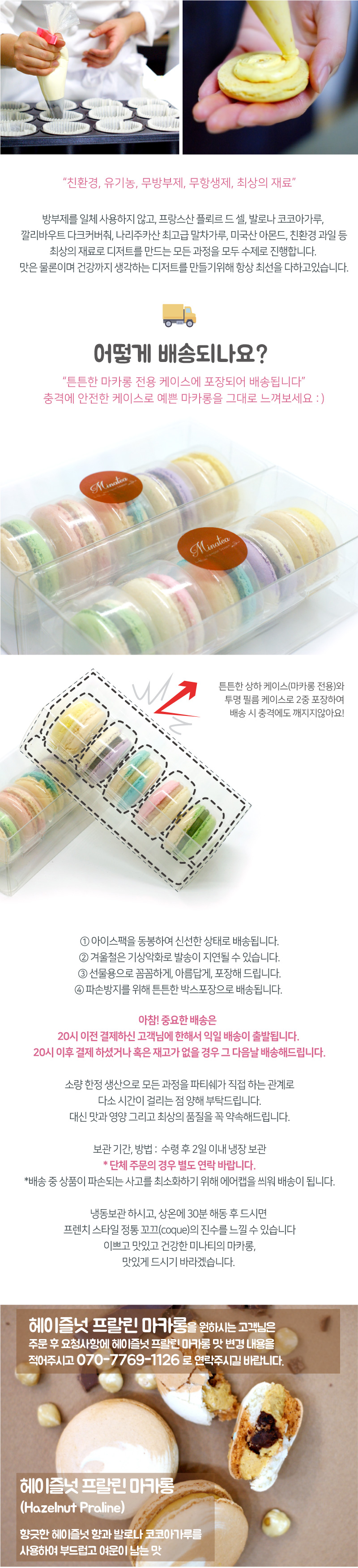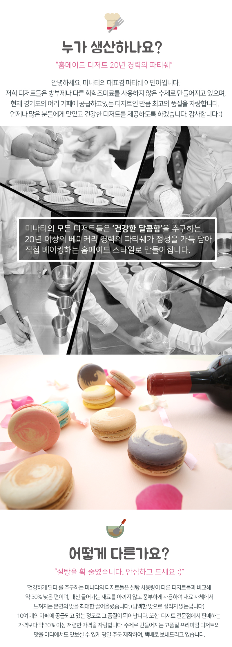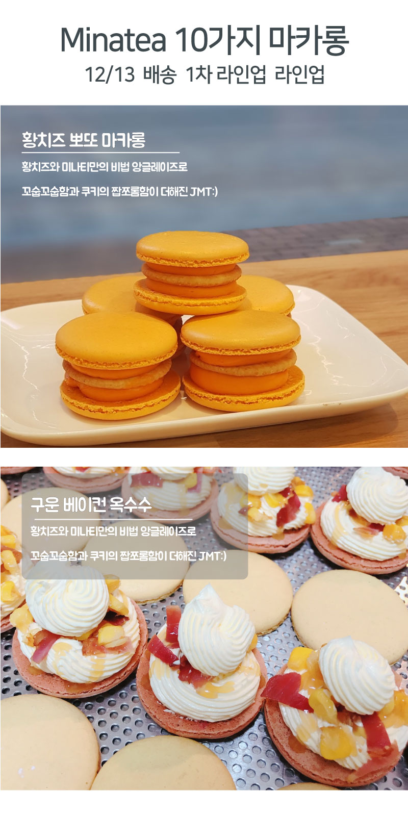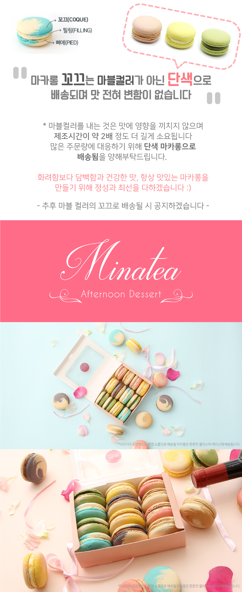 | 수제 마카롱:예쁘고 맛있고 건강한 미나티의 마카롱 구성이 대폭 변경되었습니다. 아래 내용을 참조해주세요 >.< 1) 마카롱의 사이즈가 기존 대비 2배 증가했습니다. 안의 필링이 꽉꽉 2배 채워져있어요:) 2) 매주 라인업이 바뀝니다. (그동안 7가지 맛으로 고정되었던 라인업이 매장과 함께 바뀌어 매주 금요일 라인업을 업데이트 합니다.) - 다양한 맛으로 질리지 않는 미나티의 마카롱을 기대해주세요 :) 3) 주 1회 예약출고로 변경됩니다. (보다 더 좋은 품질과 맛을 제공해드리기 위해 일주일 1회 수요일 or 목요일 배송 출발됩니다. , 자세한 사항은 상품 제목의 날짜를 고려해주시면 됩니다.) ⭐2/13 배송 ⭐ 라인업 ⭐️레드벨벳크림치즈브라우니🧀 ⭐️순수우유🥛 ⭐️앙버터 ⭐️더블초코브라우니 ⭐️와인무화과🍷 ⭐️얼그레이밀크티카라멜☕️ 10구 주문시 한구씩 골고루 들어가구요:) 5구 주문시 반드시 배송메세지에 맛을 적어주시면 반영해드리고 아니면 랜덤입니다:) 지금까지 없었던 다양한 라인업과 함께 즐거운 분위기 연출할 수 있는 디저트를 제공해드릴게요. 감사합니다 |
