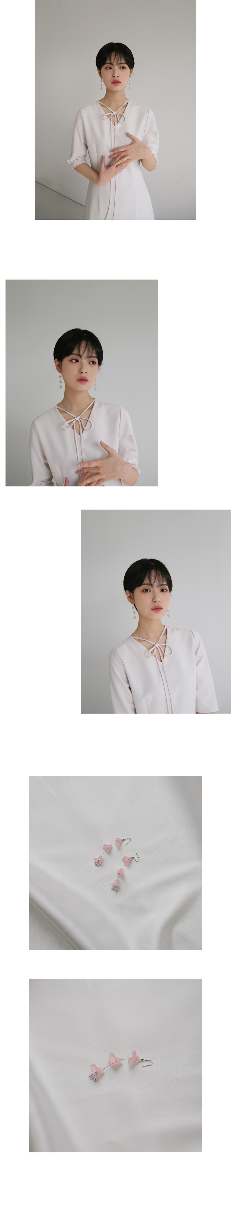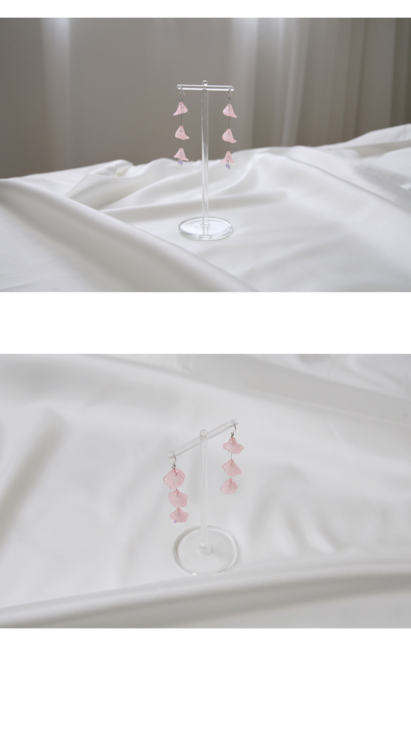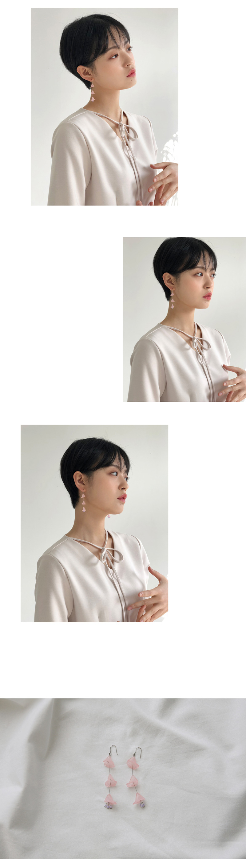 | triple flower earrings 3단으로 이루어진 연한 핑크빛의 꽃이 사랑스러운 귀걸이입니다. 귀걸이 하나만으로 얼굴을 한층 더 화사하게 톤 업 시켜주며 봄·여름 스타일링을 완성시켜 줄 활용도 높은 아이템입니다. 움직일 때마다 은은하게 흔들거리는 꽃에 시선이 가게 되는 은근한 존재감으로 소장가치 있는 추천 아이템입니다. 은침으로 제작되었으며, 가벼운 무게감으로 착용감이 편리합니다. SIZE : 총 길이 약 6.7cm MATERIAL : earpost - silver, plastic glass, beads |
