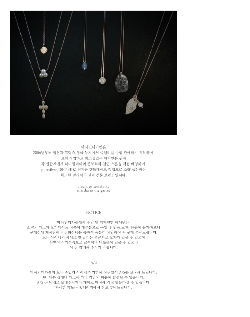 | - 빛과 광택이 좋은 천연 화이트 문스톤 adore 시리즈 목걸이입니다. - 볼륨감있는 원석이 자연광에 비추었을 때 더욱 아름답게 빛납니다. - 하이퀄리티의 원석의 무드가 엘레강스한 우아함을 표현합니다. - 얇게 컷팅된 미세 체인이 우아하고 페미닌합니다. - 데일리로 착용하실 수 있는 소장 가치있는 목걸이입니다. - 지적이면서도 순수한 아름다운 빛을 지닌 화이트 문스톤으로 더욱 스타일리시하고 러블리한 무드를 연출해보세요. * MOONSTONE * 보석의 움직임에 따라 항상 다르게 보이는 신비로운 빛이란 뜻의 이름을 갖고 있으며 옛날엔 달이 뜨고 기우는 형상을 볼 수 있다고 믿었던 신비하고 따스한 보석. 아라비아에선 부드러운 빛이 우리의 감성과 잠재의식, 직감을 강하게 해줘 우리의 존재를 완전함으로 이끄는 보석이라고 추앙한다. 한편 진정한 사랑에 눈뜨게 해주고 그 사랑을 지켜준다고 해서 “lover's stone” 이라고도 한다. 【material : 정은 (Sterling Silver 92.5%), 천연 화이트 문스톤】 【size : 체인 길이 42 cm (길이 변경을 원하시면 배송시 요구사항에 남겨주세요)】 ※ 마사인더가렛"의 모든 쥬얼리는 최고급 수입원석을 소재로 타사이트에 유통되지 않으며 100% 은 소재로서 알러지 염려가 없습니다. |