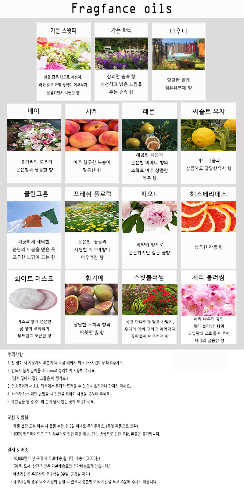 | * 아이보리 색상의 캔들 부분은 색소가 들어가지 않은 천연 왁스 그대로의 색으로 주변 온도, 시간에 따라 변색 또는 이염이 될 수 있습니다. 그리고 이중 포장으로 안전하게 배송 보내드리나 흐르는 크림의 바닥부분은 자연스러운 촛농 표현으로 일정하지 않아 배송 중 떨어질 수 있습니다. 이는 불량이 아니오니 교환, 환불이 불가능한 점 참고 부탁드립니다. ■ 우드코스터 ■ 100% 소나무 우드코스터로 나무의 특성상 갈라짐 현상, 사이즈 모양, 색상이 조금씩 달라질 수 있습니다. 우드 표면에 코팅을 하지 않은 제품이기 때문에 나무 가루 떨어짐이 있을 수 있습니다. 이는 불량이 아니니 참고 부탁드립니다. |