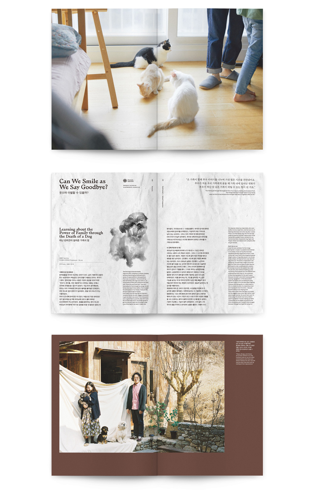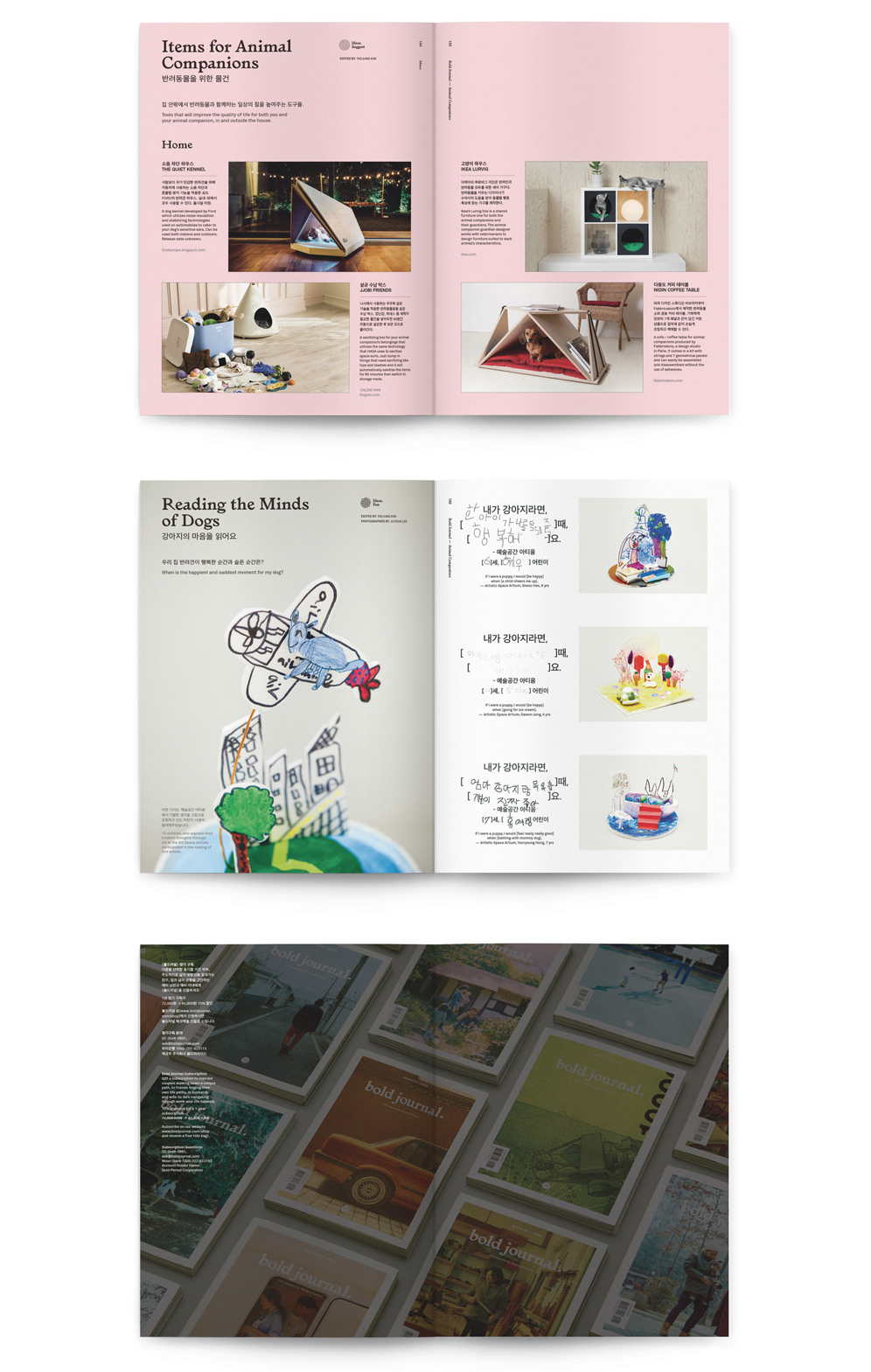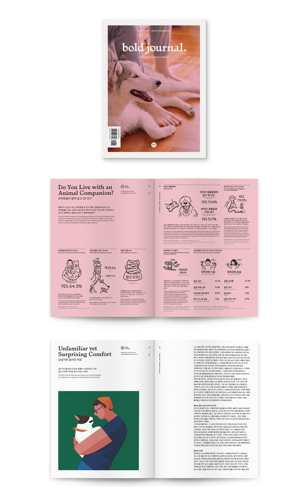 | 출판사 책 소개 (서평) 〈볼드저널〉12호는 ‘반려동물’에 대한 화두를 꺼내봅니다. 반려동물을 통해 인생에 숨어 있는 의미와 가치를 찾아가는 가족 이야기, 자신의 삶 일부를 내주며 반려동물과 공존을 꿈꾸는 이들의 진심 어린 목소리를 담았습니다. 나아가 동물을 인간 곁에 살게 한 우리가 마땅히 지키고 실천해야 할 것에 대해 생각해봅니다. 목차 Eyes. 반려동물에 대해 말하는 문장들 반려동물과 함께 살고 있나요? 낯설지만 놀라운 위로 키워도 될까요? 어느 동물원 수의사의 고백 Portraits. 가족이 되겠다는 다짐 동물과 공존하는 법을 찾는 사람들 관여하는 마음 ‘나의’라는 의미 나이 든 반려견의 시간 웃으며 이별할 수 있을까? 가족이란 이름으로 Ideas. 더불어 산다는 것의 의미 개가 사는 집 VS 고양이가 사는 집 랜선 집사 채널 가이드 도시에서 이웃과 마찰 없이 반려동물 키우기 아이와 함께 찾은 주토피아 반려동물을 위한 물건 강아지의 마음을 읽어요 기상천외한 말썽들 볼드 카툰 발행인의 말 경상도 시골에 위치한 초등학교를 다니던 시절 ‘검둥이’ 라는 이름을 지닌 잡종견을 키웠다. 어느 날 어머니가 마을 장터에서 데리고 오셔서 기르게 되었는데, 당시에는 반려견을 집 안에 들이는 문화가 생소했기에 마당에 풀어놓고 키웠다. 어린 강아지를 그렇게 키우다 보니 이리저리 돌아다니며 땅에 떨어진 것을 아무거나 주워 먹었고, 그게 원인이 되어 결국 얼마 후 세상을 떠났다. 학교에서 돌아와 죽은 검둥이를 발견하고 정말 서글프게 울었던 기억이 생생하다. 그때의 충격 때문인지 그 후로 우리가족은 반려동물을 키우지 않았고, 아직까지 나에게 반려동물이란 존재는 행복감보다는 회한의 이미지로 자리 잡고 있다. 매사에 냉철하고 이성적이던 직장 동료가 어릴적부터 키우던 반려견이 아프다는 이유로 꽤 오랫동안 연차를 쓰는 것을 보고 놀라워한 적이 있다. 다시 생각해보면, 태어나서부터 반려동물과 함께 자란 이들에게 그들의 존재 의미는 설명할 필요 없이 당연한 가족이었음이다. 그렇게 생각하니 놀라움을 느끼던 나의 모습은 비반려인으로 살아온 내 세월로 인해 공감의 폭이 좁았기 때문은 아니었는지 반성하게 된다. 〈볼드저널> 열두 번째 이슈인 ‘반려동물’을 기획하며 이 주제와 관련돼 예상 이상으로 다양하고 치열한 논의가 있다는 사실을 알았다. 그러나 여러 층위의 거창하고 복잡한 사회적 어젠다를 꺼내 늘어놓고 싶은 것은 아니다. 그저 반려동물과 살아가는 우리의 현재를 진솔하게 기록하고 싶었다. 충동적으로 입양되고 사사로운 이유로 유기되는 반려동물의 안타까운 사례가 많다. 아이들의 성화에 반려동물을 입양하고 싶은 마음이 생겼다가도 스스로 반려동물과의 삶을 감당할 수 있을지 되묻는다. 인간과 동물의 공존에 대한 거대담론을 언급하기 전에, 적어도 ‘반려동물은 도구가 아닌 생명’이라는 사실과 ‘생명을 기르는 일에는 그만큼의 책임’이 따른다는 상식 같은 전제를 제대로 인식하고 있어야 이들과 함께할 자격이 주어지는 게 아닐까. 발행인 김치호 일과 가정의 균형을 지키며 창의적으로 삶을 꾸려가는 아버지들을 위한 잡지 <볼드 저널> 〈볼드 저널〉은 현세대 아버지들이 처한 문제를 함께 고민하고 더 나은 삶을 위해 필요한 모든 것을 함께 탐구해나갑니다. 아버지가 공감할만한 주제를 발견하고 다양한 유형의 삶을 탐색하며, 아버지로서 보다 행복하고 균형 잡힌 삶을 살아가는데 길잡이가 되고자 합니다. 지은이_ 볼드피리어드 편집부 '볼드피리어드'는 건강한 가치를 추구하는 기업과 브랜드를 돕는 크리에이티브 파트너이자, 의미 있는 콘텐츠를 생산하는 미디어 컴퍼니입니다. 비즈니스와 라이프스타일의 전 영역을 대담하고 진지한 시각으로 관찰하고 눈으로 보여지는 현상과 그 이면에 숨어 있는 좋은 가치를 재발견하여, 보기 좋은 브랜드와 다양한 미디어로 변환하는 일을 합니다. |