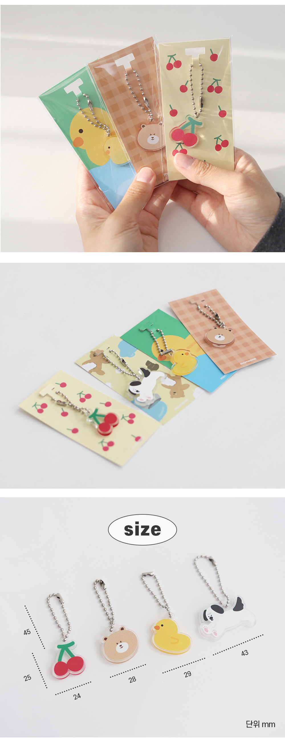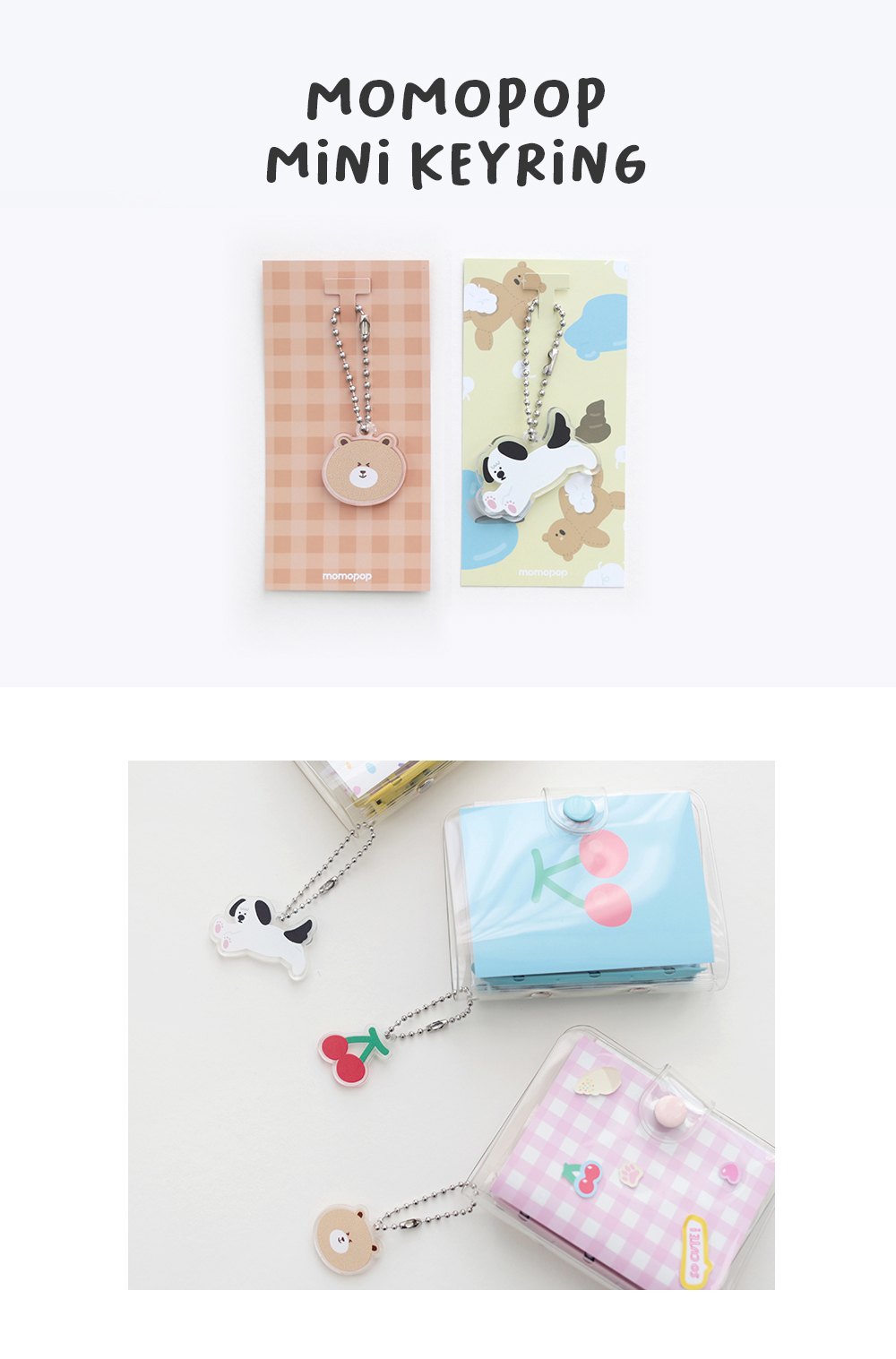투명 아크릴 3T에 사랑스러운 일러스트가 인쇄된 모모팝 미니 아크릴 키링입니다.