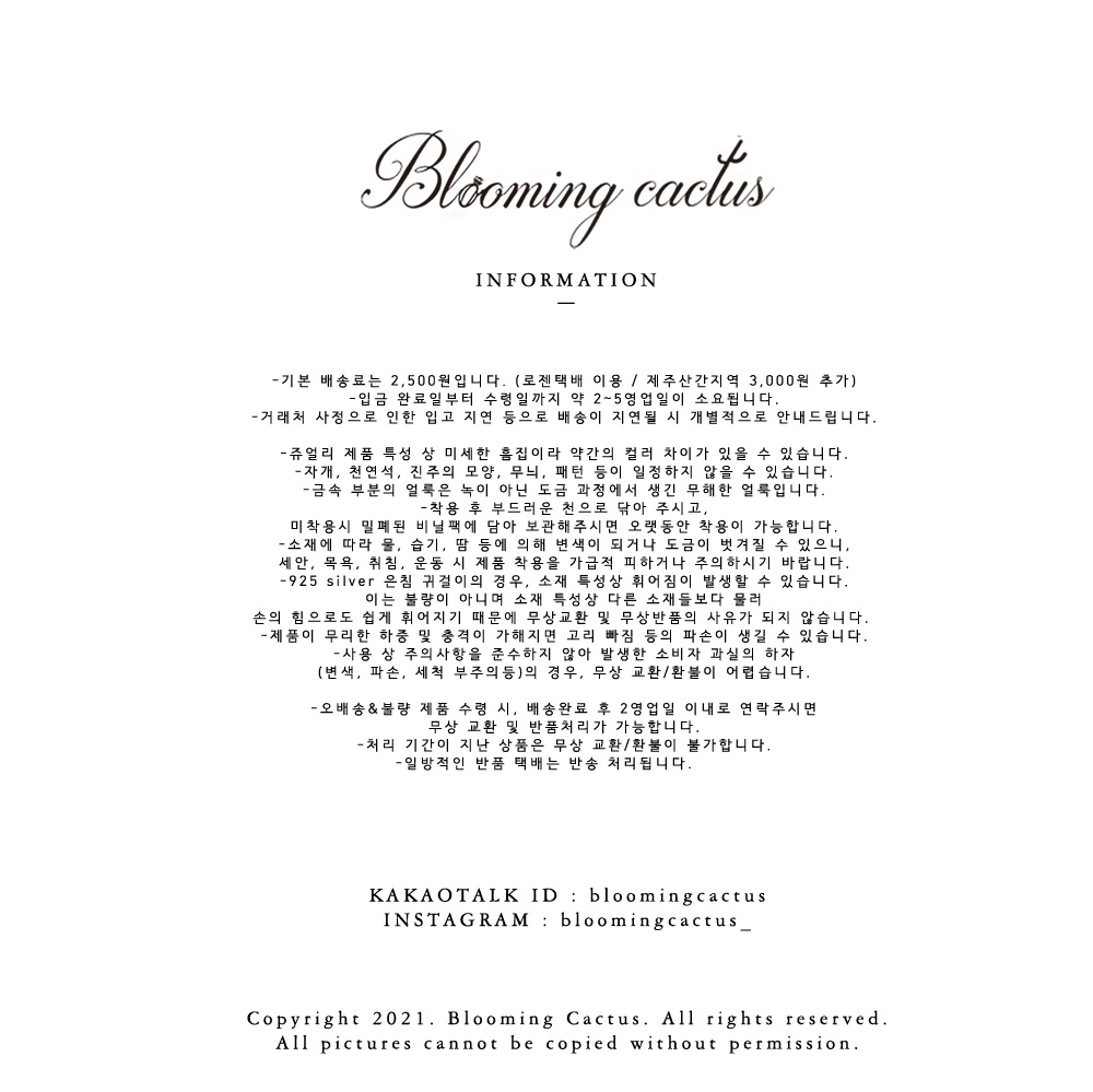 | 블루밍캑터스 배송 notice ♥ -일부 연동몰(쿠팡 등)에서 10일 후 배송예정으로 표시되나, 이는 잘못된 표기입니다. -재고가 있을 경우 당일 출고(익일 배송완료)되며, 보통 1~2일 이내 상품 준비 후 출고되어 주문 후 2~5일 이내 배송이 완료됩니다. -배송이 지연될 경우 개별적으로 안내드리고 있으니 착오 없으시길 바랍니다. **집게핀의 경우, 미세 기스와 미세 까짐은 제작 과정이나 배송 중 생길 수 있는 부분으로 무상 교환 및 반품 사유가 되지 않습니다. |