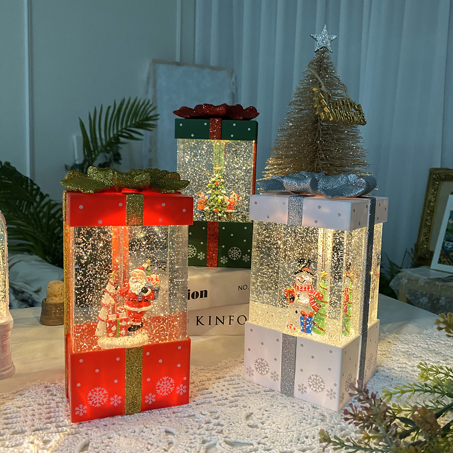 크리스마스 선물 모양 스노우볼 워터볼 오르골 아크릴 LED 무드등 조명 그린 와인리본