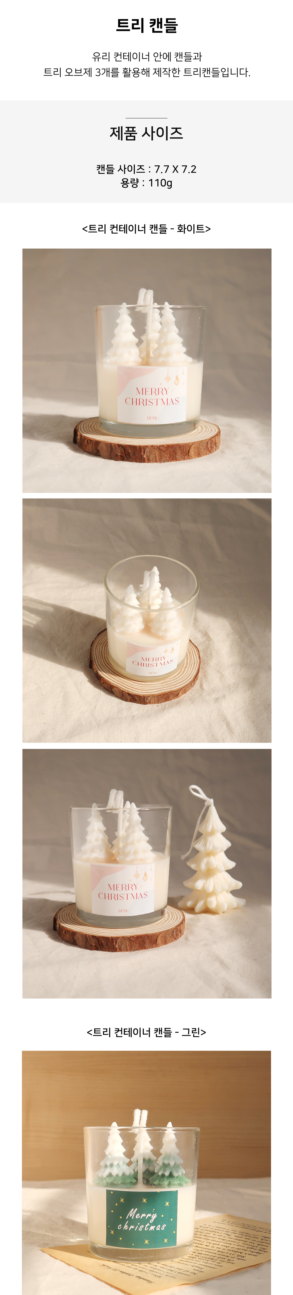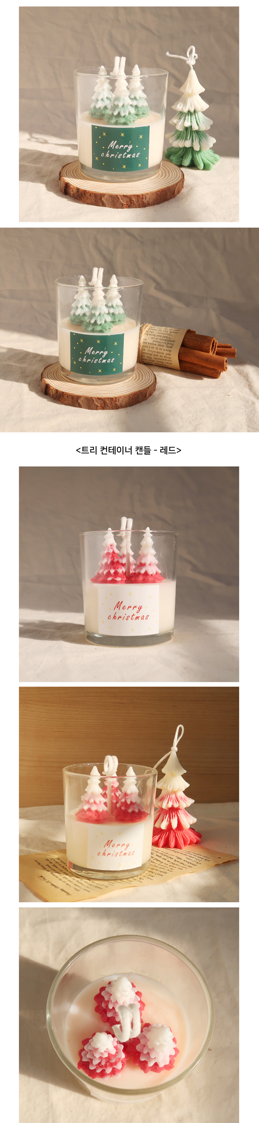 작은 트리 캔들 3개를 컨테이너 안에 배치한 크리스마스 트리 캔들입니다.