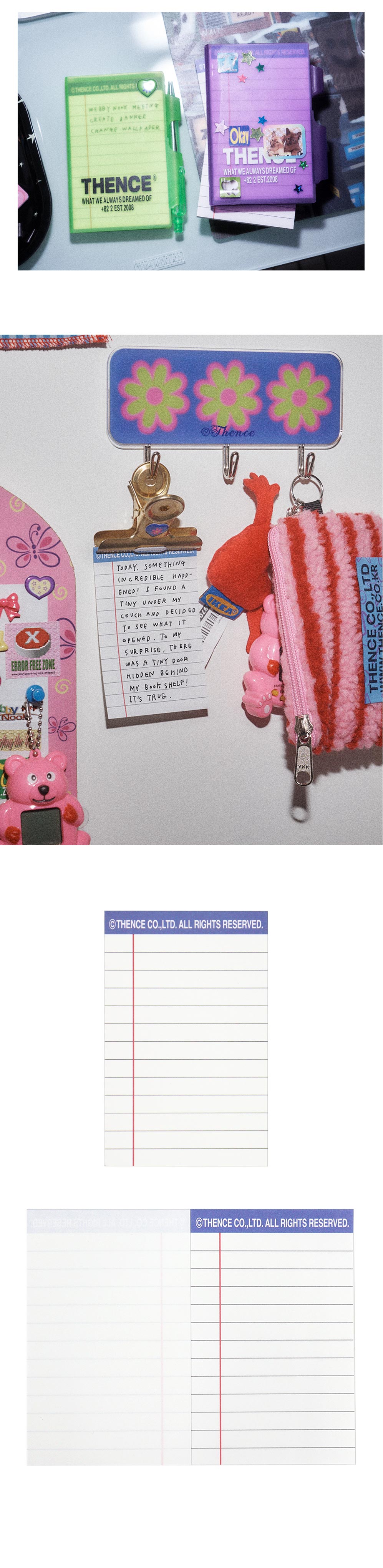 | Size : 6.3 x 9.8 (cm) / Material : Paper(80g) / Color : Mix / Quantity : 100 sheets / Made in Korea - 메모 키트 사이즈에 맞게 제작된 심플한 라인 디자인의 메모 패드입니다. 손안에 꼭 들어오는 사이즈로, 체크리스트로 사용하거나 간단한 메모 등을 남기기 좋은 아이템입니다. - 비접착형 제품으로 한 장씩 뜯어서 가볍게 사용하는 아이템입니다. 구매 전 참고 부탁드립니다. |