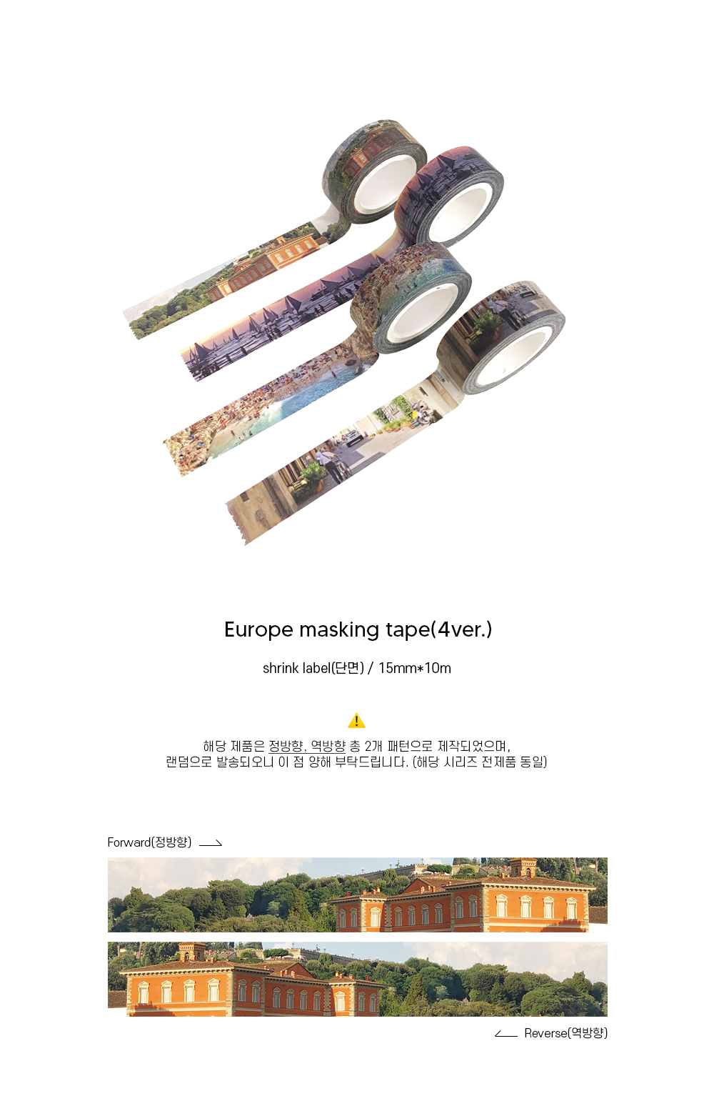 - Size. 15mmx10m- Packing. Shrink label(단면)- 제작특성상 1-5mm 밀리거나 오차 있을 수 있습니다.- 해당 제품은 정방향, 역방향 총 2개 패턴으로 제작되었으며, 랜덤으로 발송되오니 양해 부탁드립니다.