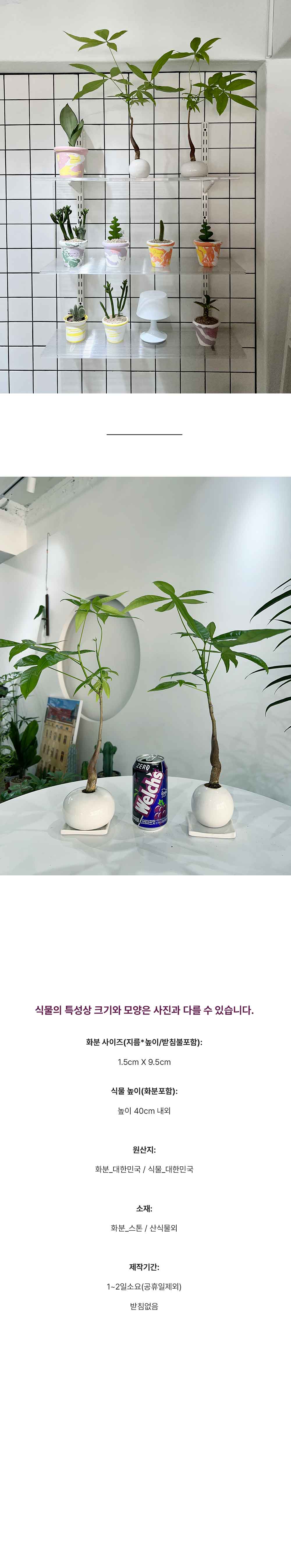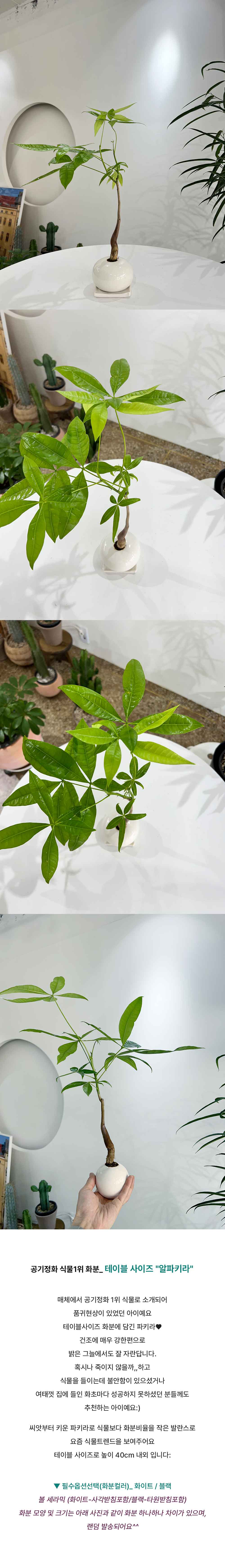 | 공기정화 식물1위 화분_ 테이블 사이즈 "알파키라" 매체에서 공기정화 1위 식물로 소개되어 품귀현상이 있었던 아이예요 테이블사이즈 화분에 담긴 파키라♥ 건조에 매우 강한편으로 밝은 그늘에서도 잘 자란답니다. 혹시나 죽이지 않을까,,하고 식물을 들이는데 불안함이 있으셨거나 여태껏 집에 들인 화초마다 성공하지 못하셨던 분들께도 추천하는 아이예요:) 씨앗부터 키운 파키라로 식물보다 화분비율을 작은 발란스로 요즘 식물트렌드을 보여주어요 테이블 사이즈로 높이 40cm 내외 입니다: |