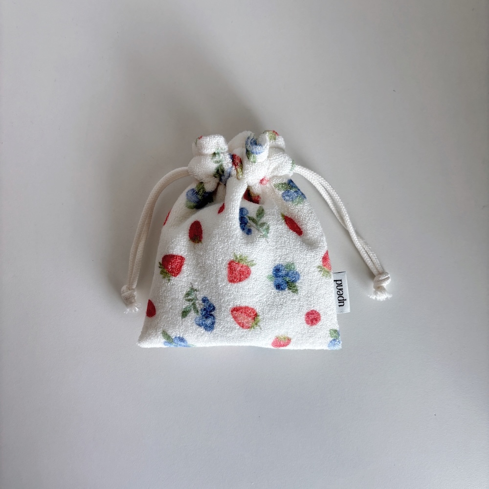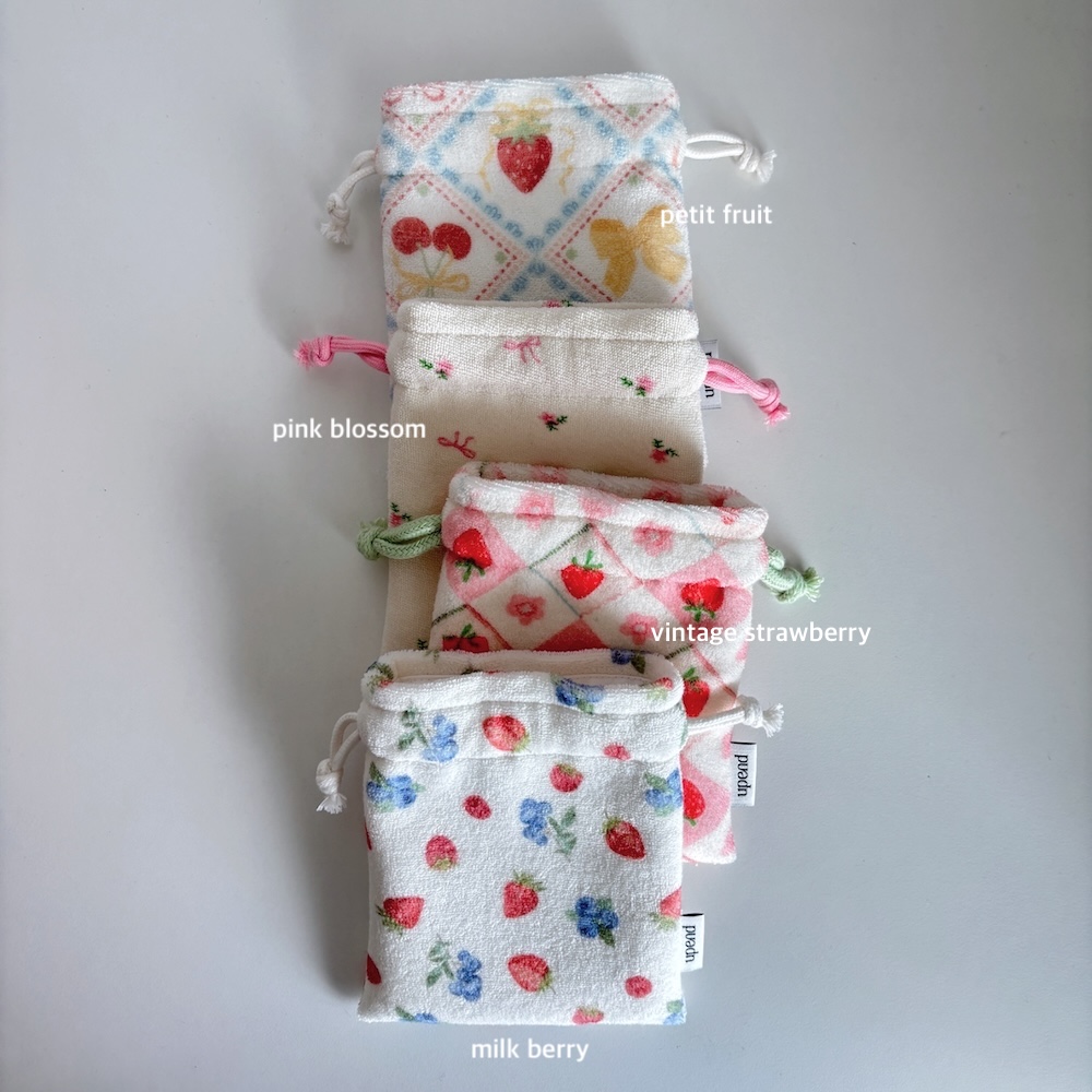 | 미니 사이즈의 스트링 파우치 입니다. 안감은 생활방수가 되는 리사이클 나일론 원단을 사용했습니다. 작은 소지품을 넣기 좋은 사이즈 입니다. *화장품 쿠션(지름7.5cm)이 딱 맞게 들어가는 사이즈입니다. 구매 시 참고 부탁드립니다. size 가로 X 높이 (cm) 12 X 14 color : vintage strawberry / petit fruit / pink blossom / milk berry material : terry / recycle nylon |