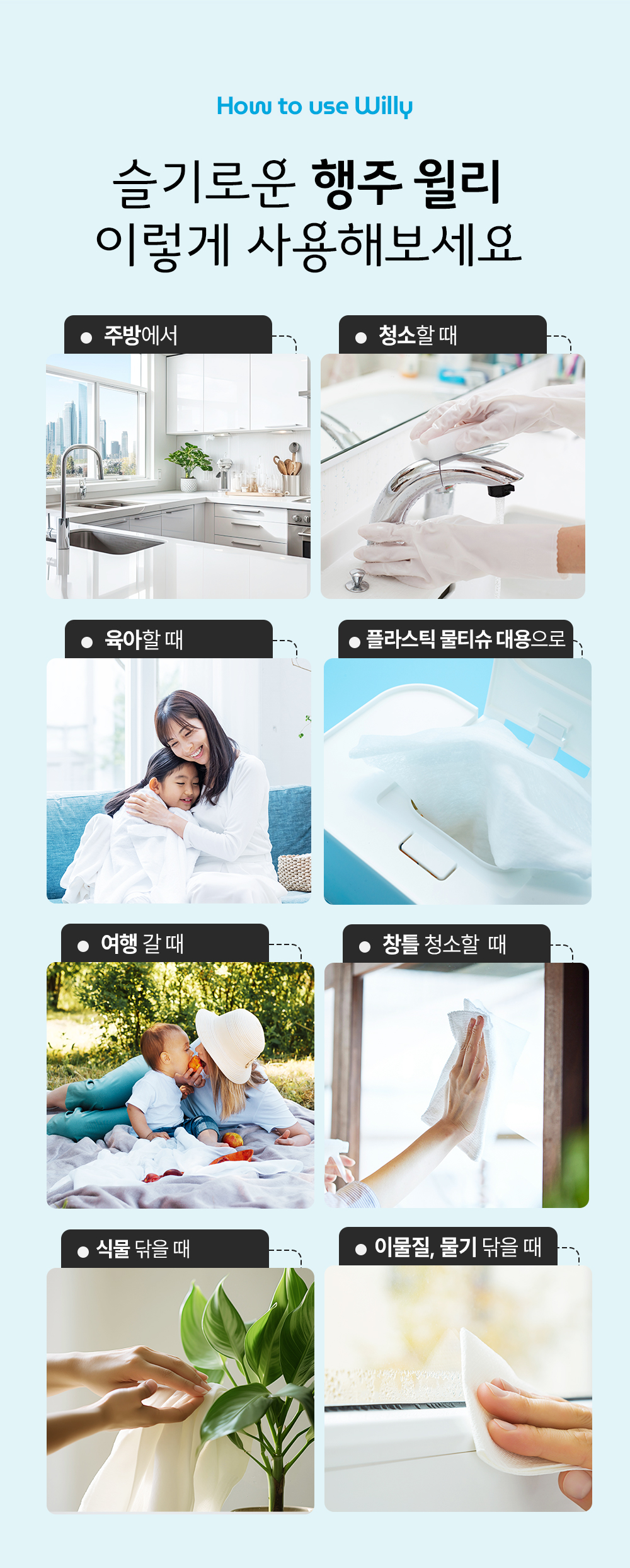 윌리 사용법 : 행주 윌리 : 동전 모양으로 압축된 상태에서 물에 적셔 부풀리기