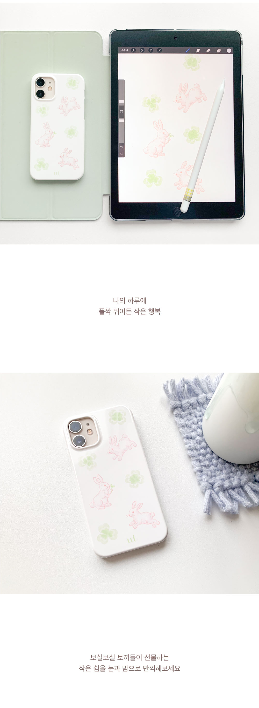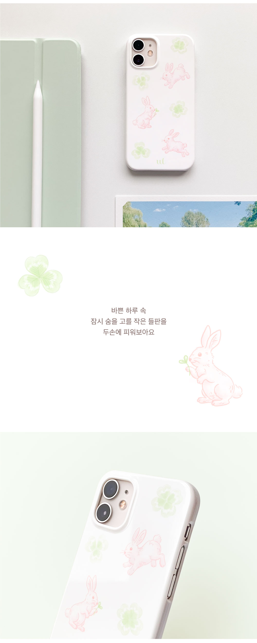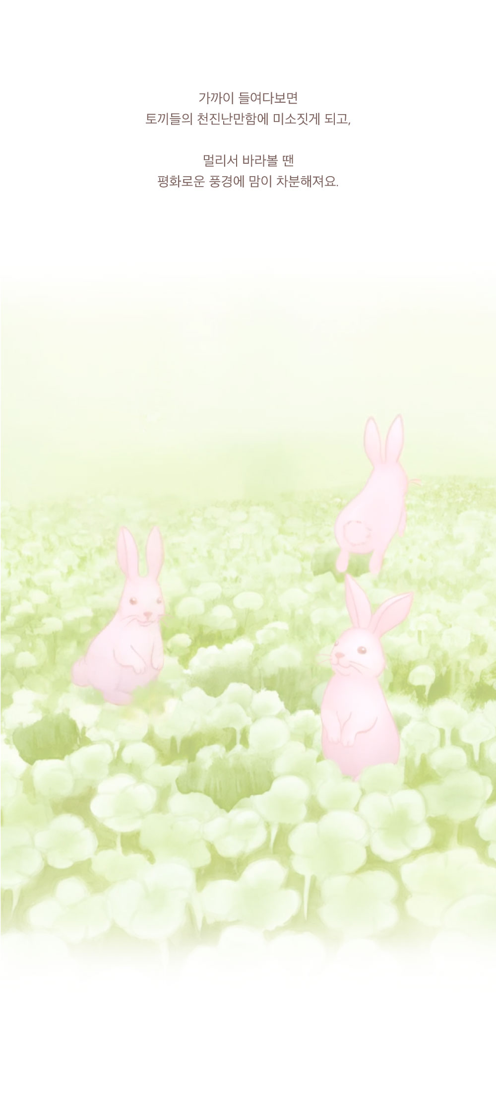 작은 토끼들이 풀냄새를 들숨에 한가득 머금고 들판을 자유로이 뛰놀고 있어요. 다소 숨가빴던 하루, 잠시 숨을 고를 작은 들판을 두 손에 피워보아요. :)