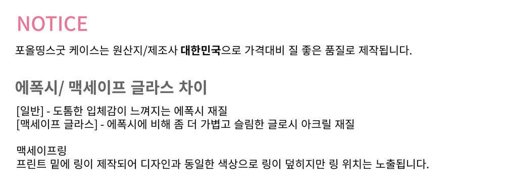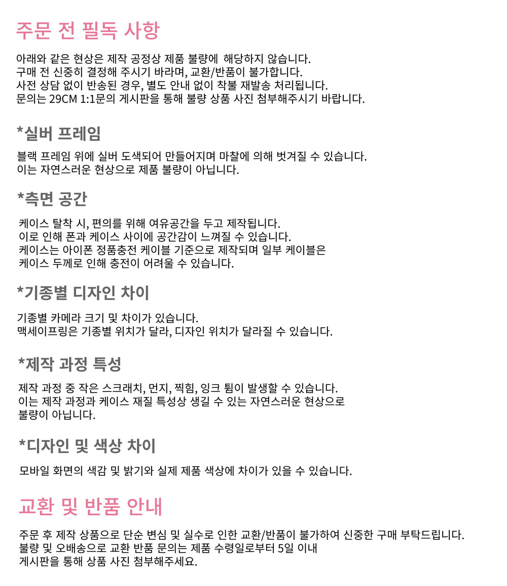 -Epoxy 범퍼 소재로 미끄러짐 방지, 위/아래가 막혀있어 외부 충격에 매우 강합니다. -주문제작 형식으로 제작기간 약 4 - 5일 소요 - *제품 유의사항 필독* 실버에폭시는 도금 처리된 영역으로 사용 중 벗겨짐현상이 발생할 수 있습니다.