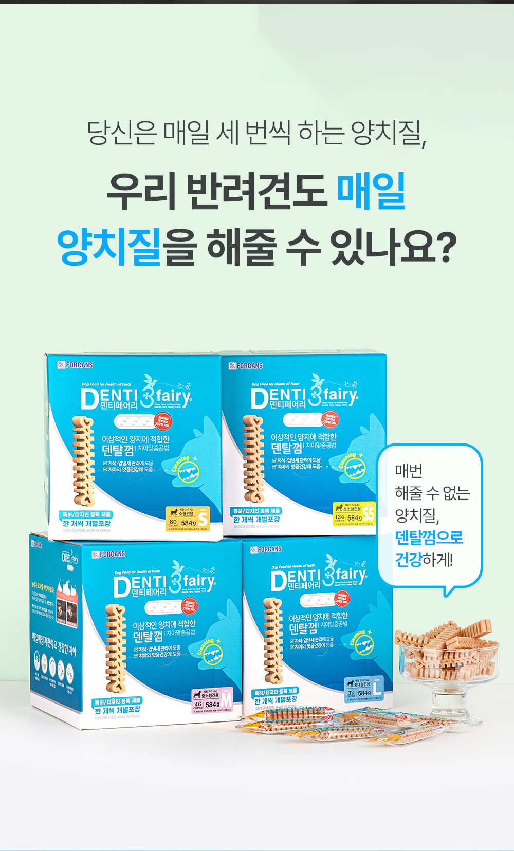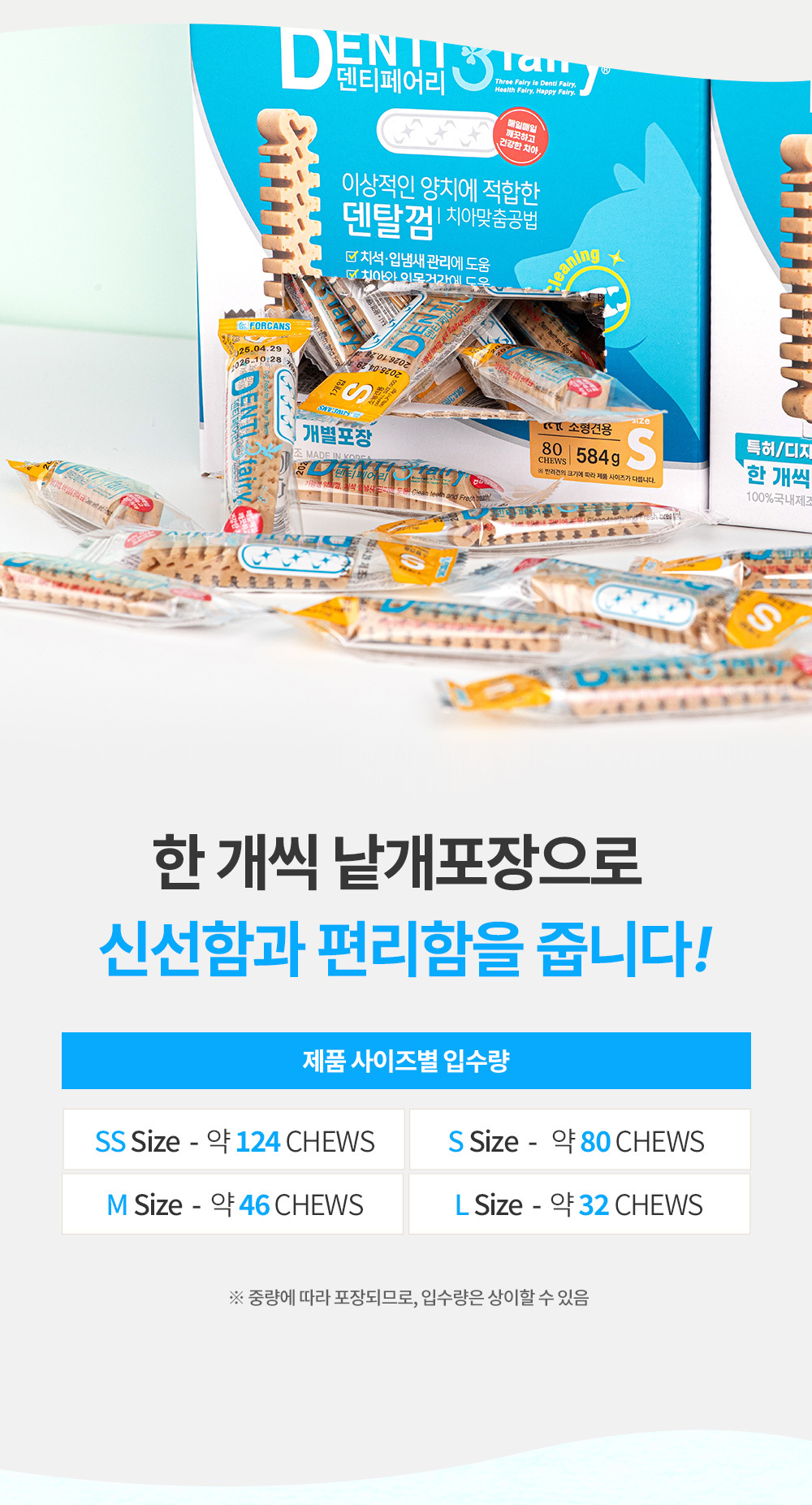 한 개씩 위생적인 낱개포장으로 신선하게 급여 가능한 강아지 덴탈껌,
