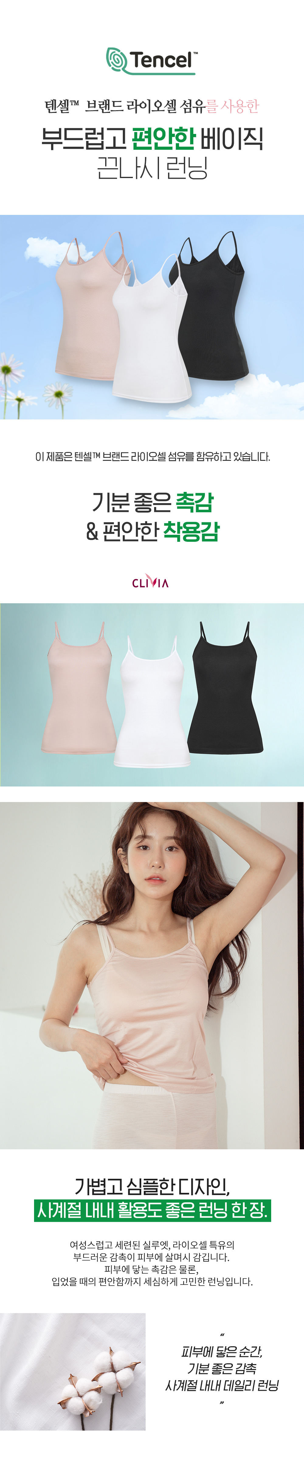 사계절 필수 아이템! 보들보들한 촉감에 신축성 좋은 텐셀소재의 여성 나시런닝입니다.
