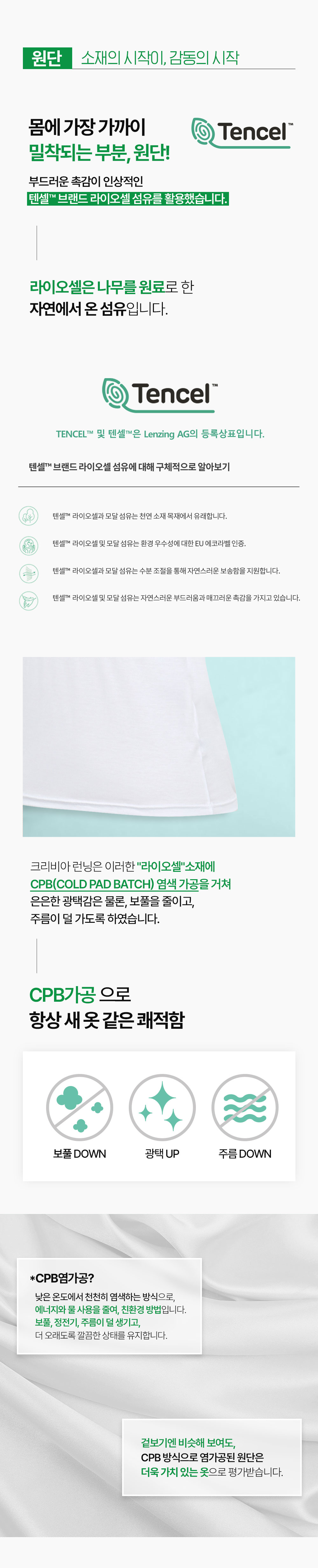 자연친화적인 소재인 텐셀원단은 수분조절 기능이 있어 수분을 신속히 외부로 전달하기 때문에 건조하고 쾌적하게 해줍니다.
