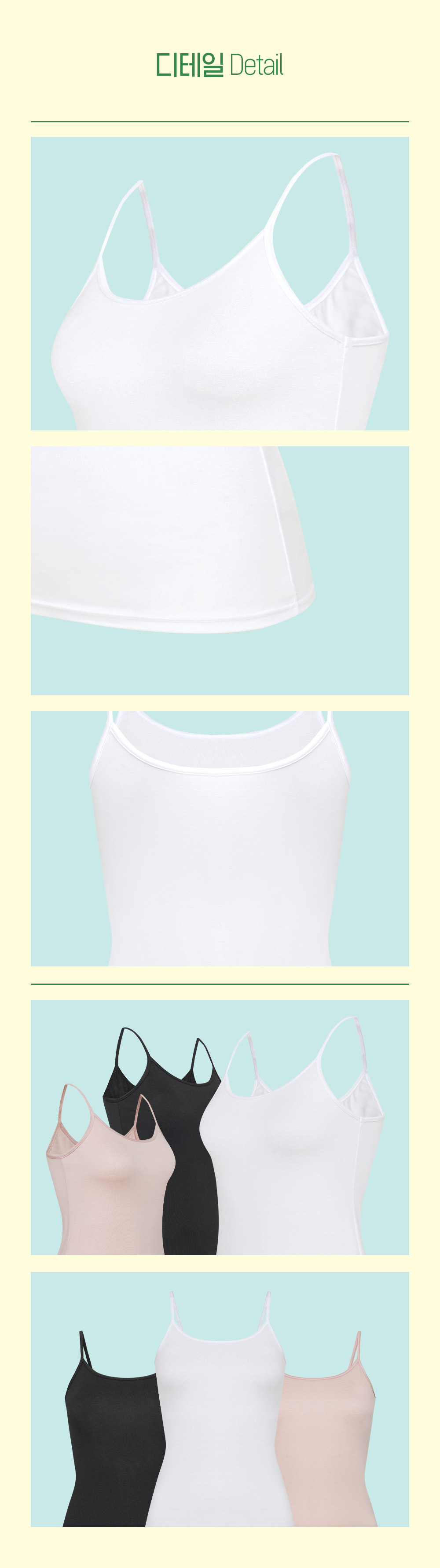 어깨끈 부분과 가슴라인 테두리를 텐셀소재 원단으로 바이어스를 처리하여 신축성이 좋으며