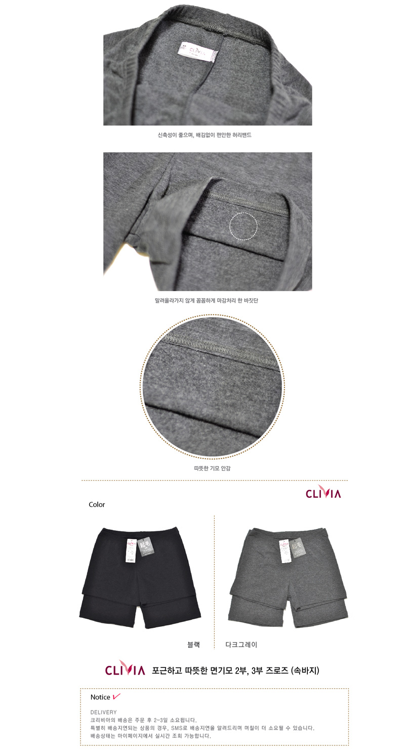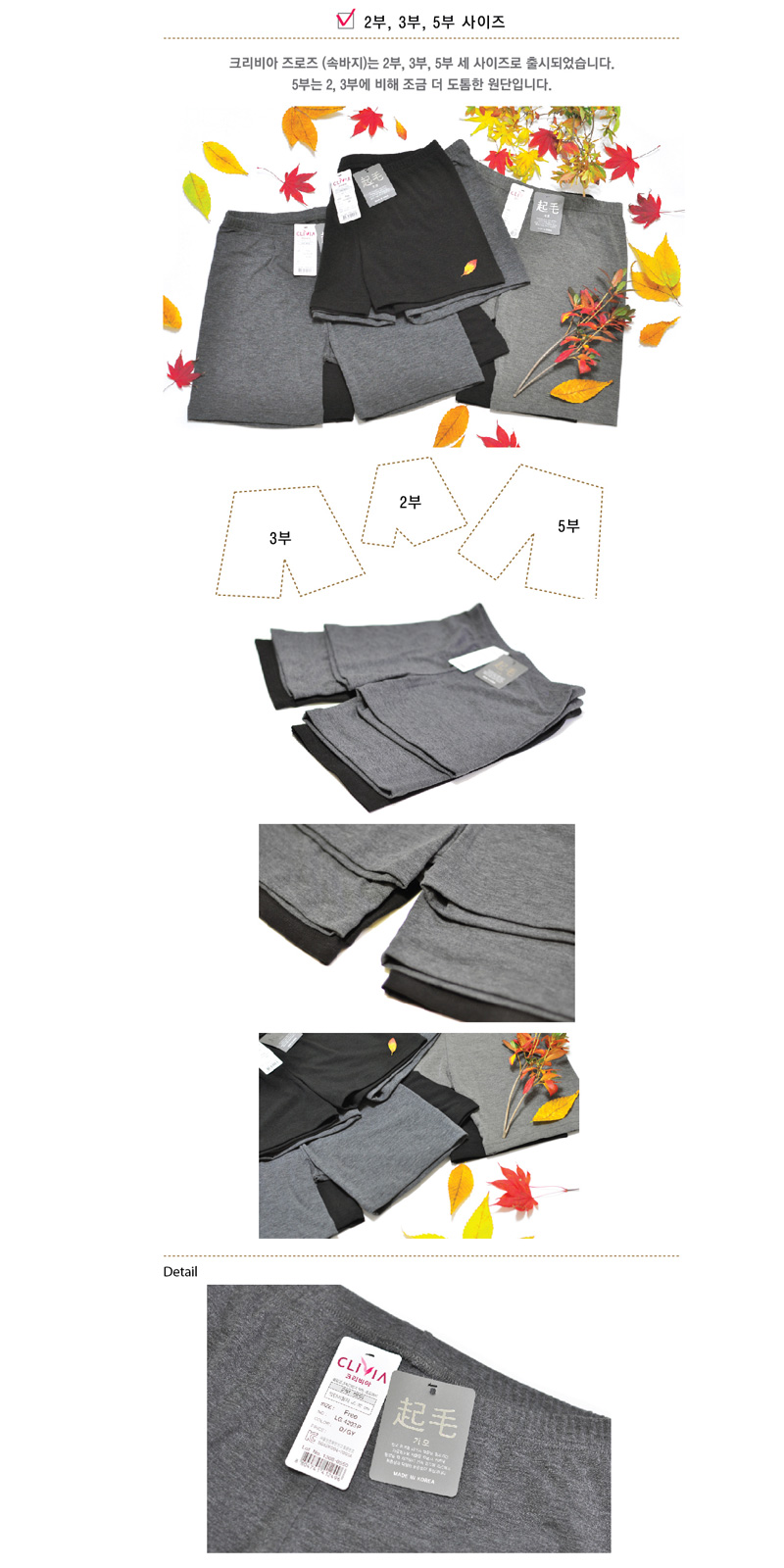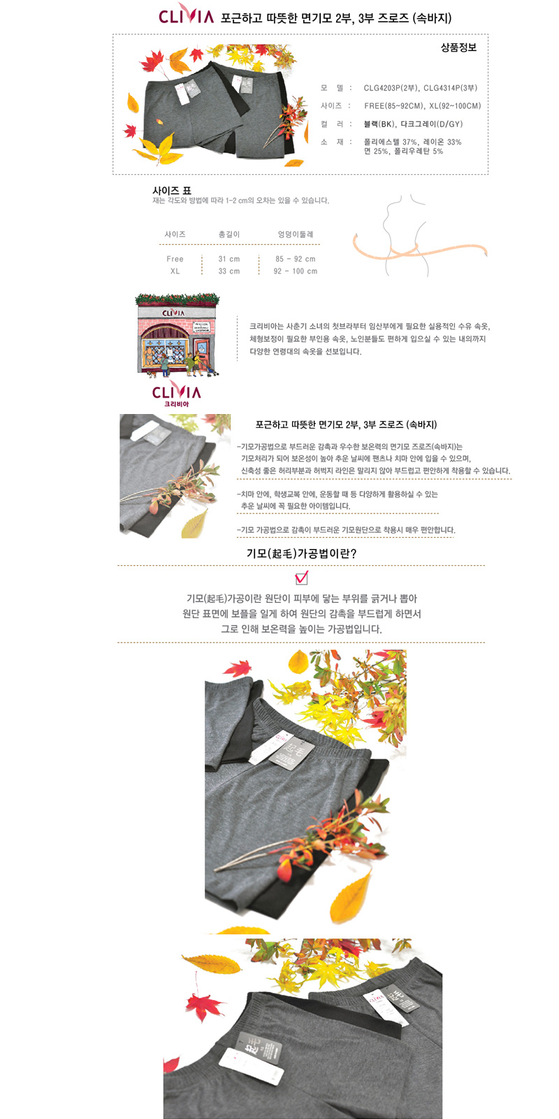 | *기모가공법으로 부드러운 감촉과 우수한 보온력의 면기모 즈로즈(속바지)는 안쪽에 기모처리가 되어있어 보온성이 높으며, 추운 날씨에 팬츠나 치마 안에 입기 좋습니다. *신축성 좋은 허리밴드는 허리부분을 편안하게 해주며, 허벅지 라인은 말리지 않아 부드럽고 편안하게 착용할 수 있습니다. *치마 안에, 학생교복 안에, 운동할 때 등 다양하게 활용하실 수 있는 추운 날씨에 꼭 필요한 아이템입니다. *기모(起毛)가공법이란? 기모(起毛)가공이란 원단이 피부에 닿는 부위를 긁거나 뽑아 원단 표면에 보플을 일게 하여 원단의 감촉을 부드럽게 하면서 그로 인해 보온력을 높이는 가공법입니다. |